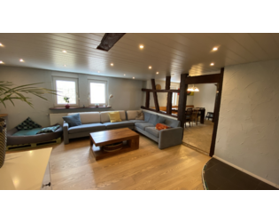 Im Obergeschoss steht Ihnen ein geräumiges Wohnzimmer mit einem separaten, offenen Essbereich zur Verfügung. Dieser ist durch seine freigelegten Fachwerkbalken ein wahrer Hingucker. Angrenzend befindet sich die moderne Einbauküche, die viele Auszüge für Ihre Kochutensilien vorhält und zum gemeinsamen Kochen einlädt. Zudem bietet diese Etage ein Schlafzimmer, ein Ankleide- oder Kinderzimmer und ein Gäste-WC mit Fußbodenheizung.