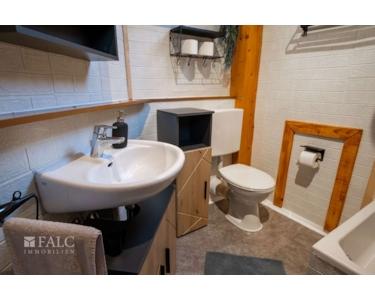 Das moderne Badezimmer verfügt über eine Dusche und ein WC.