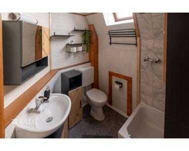 Der offene Wohnbereich ist geschmackvoll eingerichtet und hell. Die integrierte Küche ist vollständig ausgestattet – inklusive Kühlschrank mit Gefrierfach, Herd und Tisch-Spülmaschine. Der Schlafbereich befindet sich auf einer Galerie und bietet mit Bett und Stauraum einen gemütlichen Rückzugsort. Ein Schlafsofa kann ausgezogen werden und bietet eine zusätzliche Schlafmöglichkeit.