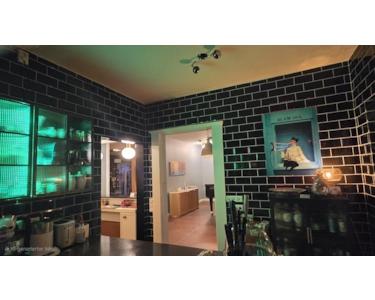 Oder Sie kochen etwas in der bis zur Decke mit schwarz (metro)ge-fliesten Küche. Das beleuchtete Lichtband aus Hängestahlschränken mit Stabglas wähnt Sie mehr in einer Cocktailbar als Küche.