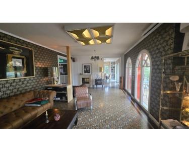 Das Haus wurde 2023/2024 neu gestylt und eingerichtet, hat teils weiße Holzvertäfelungen, kombiniert mit teuren Designertapeten. Das apricotfarbene Esszimmer mit Blick auf Pool und Garten wird von einem weißlackierten Bücherregal umsäumt. Das Wohnzimmer trägt eine goldene Samtmustertapete mit Blick durch die Rundbogenfenster auf die Westterrasse. Die Böden sind in den Bädern Antikmarmor, in den Wohnräumen teils Zementfliesen mit wunderschönen Mustern.