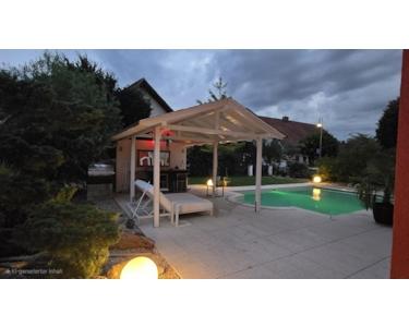 Sommers sitzen Sie Abends am geheizten Außenpool mit römischer Treppe und genießen im beleuchteten Felsgarten Ihr Glas Rotwein mit Blick auf den Sonnenuntergang über dem Stadtberger Wald. Der Wohngarten mit 3 großen und überdachten Terrassen nach West, Ost und Süd lädt an überdachter Bar vor dem Pizzaholzofen zum Verweilen ein. Die letzten Sonnenstrahlen im Dorf treffen Ihr neues Haus.