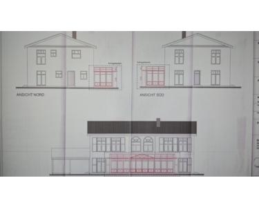 Das Wohnzimmer ist durch einen bereits genehmigten Wintergarten um 26 m² (10 m breit, 3 m tief) nach Westen erweiterbar.