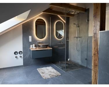 Ein weiteres Highlight ist das außergewöhnlich gestaltete Badezimmer, das sich klar vom Standard abhebt und den hochwertigen Anspruch der Wohnung konsequent fortsetzt.