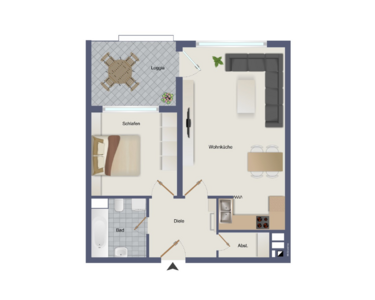 Der helle Wohn- und Essbereich bildet den Mittelpunkt der Wohnung und bietet direkten Zugang zum überdachten Balkon, der zusätzlichen Wohnkomfort schafft. Das Schlafzimmer ist gut geschnitten und ruhig gelegen. Ergänzt wird das Raumangebot durch einen separaten Abstellraum, der wertvollen Stauraum im Alltag bietet. Die Einbauküche gehört zur Wohnung und ist bereits im Mietpreis enthalten. Die Waschmaschine findet ihren Platz direkt im Badezimmer.
