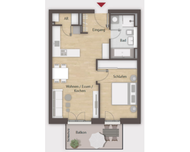 Die Wohnung besteht aus zwei gut geschnittenen Zimmern und barrierefrei zugänglich sowie einem großzügigen Balkon.