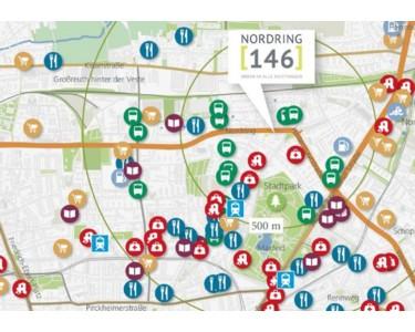 Apotheke, Lebensmittel-Discount, Allgemeinmediziner, Kindergarten, Grundschule, Hauptschule, Realschule, Gymnasium, Gesamtschule, Öffentliche Verkehrsmittel