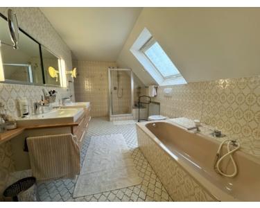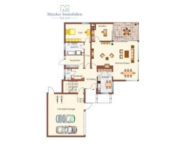 Repräsentatives, gepflegtes Wohnhaus mit Doppelgarage und großem Wellnessbereich in bevorzugter Lage. Das große Grundstück mit schönem Garten in Süd-Westausrichtung ist mit einem Sichtschutzzaun vor fremden Blicken geschützt. Insgesamt bietet das Haus absolut gehobenen Wohnkomfort, verteilt auf das Erdgeschoss mit großzügigem Wohn-Essbereich mit Kamin, verglaster Terrasse, Küche mit Einbauküche, Arbeitszimmer, Flur mit Garderobe, Gäste WC, Hauswirtschaftsraum und einem separaten Bereich mit Schlafzimmer und Bad mit Wanne, Dusche und WC. Im Dachgeschoss befinden sich ein Schlafbereich mit Ankleide, überdachtem Balkon und Bad mit Wanne, Dusche, Bidet und WC, Abstellraum sowie zwei Kinderzimmer mit Balkon und eigenem Duschbad mit WC.
