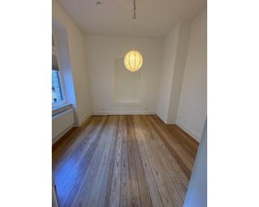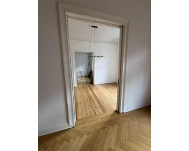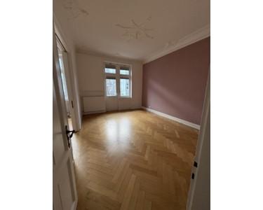 Die Wohnung liegt im 1. Obergeschoss und beeindruckt durch lichtdurchflutete Räume, hohe Decken mit Stuckverzierungen sowie charmante Zierelemente. Drei kleine Balkone bieten sowohl Morgen- als auch Abendsonne – ideal zum Entspannen im Freien. Zur Strassenseite befinden sich drei große Zimmer, die durch das Öffnen der originalen Kassettentüren ein beeindruckendes Raumgefühl erzeugen. Im größten Zimmer steht noch ein Kinderhaus, welches nach Wunsch übernommen werden kann. Auf der Seite zum Innenhof liegen die weiteren Zimmer sowie Küche und Bad. Ebenfalls bietet das in den Raum integrierte Ankleidezimmer ausreichend Platz.