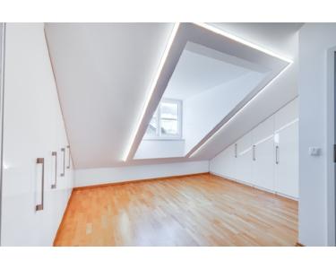 Das gesamte Dachgeschoss bildet das Masterschlafzimmer. Ein großes Fenster, eingerahmt von einem stimmungsvollen Lichtelement, durchflutet den Raum mit Tageslicht. Den Dachschrägen angepasst wurden maßgefertigte Schränke verbaut. Zusätzlich ein Schreinerbett, mit integrierter Beleuchtung und eingelassenen Steckdosen.