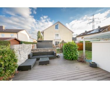 Das Herzstück des Erdgeschosses bildet ein offener, großzügiger Wohnbereich mit hellem Stäbchenparkettboden. Die moderne Schreinerküche ist harmonisch in den Wohnraum eingebunden und schafft gemeinsam mit dem Wohnzimmer eine offene und einladende Einheit. Über dem Esstisch befindet sich ein abgehängtes Deckenelement mit integrierter Beleuchtung, das diesen Bereich besonders hervorhebt. Von hier aus gelangen Sie auf die Terrasse, die mit einer gemütlichen Lounge-Ecke zum Verweilen einlädt. Ein kleines Gartenhaus sorgt für zusätzlichen, praktischen Stauraum. Vom Eingangsbereich aus erreichen Sie zudem das renovierte Gäste-WC. Darüber hinaus ist das gesamte Erdgeschoss mit Rollläden ausgestattet.