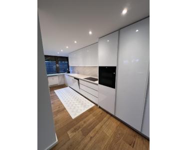 Die Wohnung verfügt über zwei großzügige Zimmer, einen offenen Wohn- und Essbereich sowie eine halboffene Küche mit hochwertigen Markengeräten (Siemens Kühl-/Gefrierkombination, Bosch Backofen, Delonghi Kaffeemaschine, LG Waschtrockner, Dyson Staubsauger).
