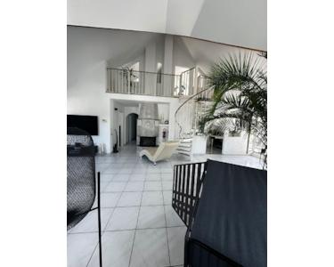 Der Weg führt weiter in den großzügigen Wohn- und Essbereich mit über 4 Meter hohen Decken, Kamin und Klimaanlage. Hier befinden sich auch der Essplatz, die offene und dennoch optisch abgetrennte Küche sowie die elegante Wendeltreppe, die auf die obere Ebene führt. Im Dachgeschoss verlaufen auf beiden Seiten der Galerie zwei mit Licht ausgestattete Stauraumflächen unter der Schräge. Geradeaus gelangt man durch eine große Glastür in einen hellen Raum, der sich ideal als Büro oder Hobbybereich eignet. Dort befindet sich auch ein separater Technikraum mit der eigenen Etagenheizung.