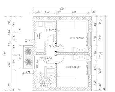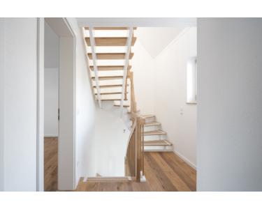 Das Obergeschoss gestaltet sich als komfortabler Rückzugsort für die Familie. Hier stehen zwei Schlafzimmer sowie ein Badezimmer mit bodengleicher Dusche zur Verfügung. Das offene Treppenhaus sorgt dafür, dass auch diese Etage von Licht durchflutet wird.
