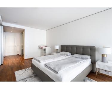 Die Wohnung besticht durch ihre hochwertige Ausstattung: Im gesamten Wohnbereich wurde edler Kirschholz-Schiffsboden verlegt, der für ein warmes, luxuriöses Ambiente sorgt. Auch in den Badezimmern wurde auf höchste Qualität geachtet, hier wurden cremefarbiger Natursteinfliesen verlegt, die eine elegante Atmosphäre schaffen.