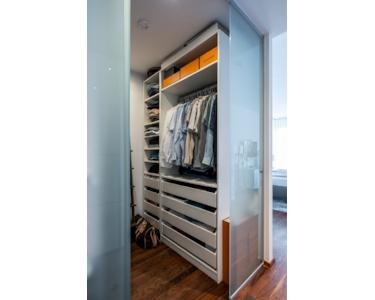 Direkt Neben an befindet sich das Schlafzimmer, welches ebenfalls hell und freundlich wirkt und über ein separates Ankleidezimmer von etwa 15,9 m² verfügt. Zu Beginn des Flurs finden Sie das erste Badezimmer, das mit einer modernen Dusche ausgestattet ist.