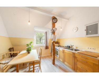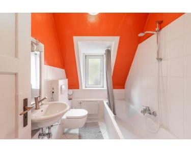 Das Tageslichtbad mit Badewanne sorgt für ein angenehmes Wohlfühlambiente. Typisch für den klassischen Altbau: schöne Dielenböden, sichtbare Holzbalken und gemütliche Dachschrägen verleihen der Wohnung ihren besonderen Charakter.