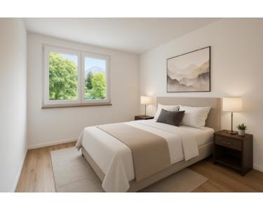 Es handelt sich hier teilweise um maßstabsgetreue Fotos, welche mit KI bearbeitet wurden. So oder ähnlich könnte der Raum nach erfolgter Renovierung und mit neuer Ausstattung aussehen.