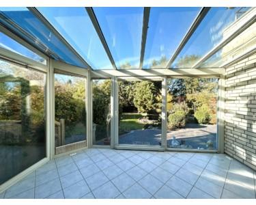Im Erdgeschoss stehen ein Wohn- und Essbereich mit Zugang zur Terrasse, eine Küche, ein Schlafzimmer, ein Arbeitszimmer, ein Vollbad, ein Gäste-WC sowie ein Abstellraum zur Verfügung. Der Wintergarten erweitert den Wohnbereich und bietet zusätzlichen Platz. Große Fensterflächen mit Wärmeschutzverglasung und elektrischen Rollläden im Erdgeschoss sorgen für eine gute Belichtung der Räume.