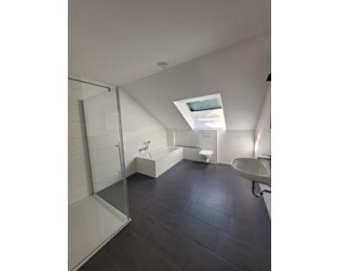 Das großzügige Badezimmer mit Tageslicht im Dachgeschoss ist mit einer Badewanne und einer großen Dusche ausgestattet.