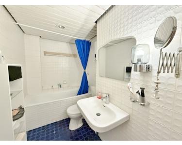 Das innenliegende Wannenbad ist mit weißen Wandfliesen und blauen Bodenfliesen aus dem Baujahr ausgestattet.