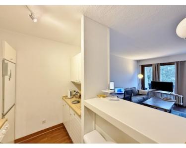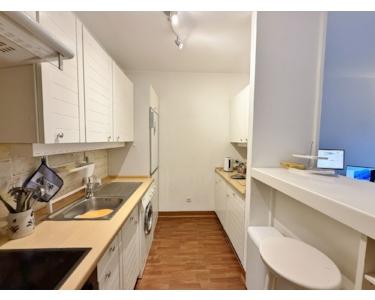 Die Küche der Wohnung ist funktional mit Elektrogeräten ausgestattet. Der offene Blick in den Wohnbereich sorgt für viel Licht und ein gemütliches Ambiente.