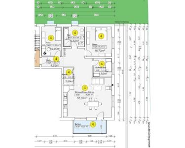Gebäude: Bei dem 8- Parteienhaus handelt es sich um einen Neubau, die Wohnungen sind zum Erstbezug. Das Haus wird nach dem Effizienzhaus 55 Standard (mit automatischer Belüftungsanlage) gebaut und über eine ökologisch nachhaltige Wärmepumpe beheizt. Das Mauerwerk besteht aus 42,5er Ziegelstein, welches mit Wärmedämmmaterial verfüllt ist. Die Zwischendecken sind aus Stahlbeton. Die Böden sind jeweils ebenfalls gedämmt und mit Design – Vinylboden versehen. Die Fenster der Wohnung sind Kunststofffenster mit 3-Scheiben Isolierverglasung, die Türen und Türzargen sind weiß gehalten.