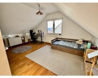 Das Haus verfügt außerdem über flexible Gestaltungsmöglichkeiten: Die Küche kann ohne großen Aufwand zu einer offenen Wohnküche umgebaut werden. Ebenso lässt sich das große Zimmer im Obergeschoss mit wenigen Maßnahmen in zwei eigenständige Räume teilen – ideal für wachsende Familien oder Homeoffice-Bedarf.