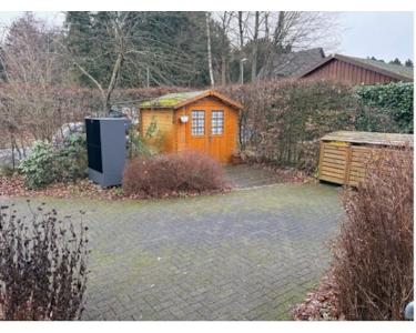 Gartenhaus hinten im Garten und Fahrradschuppen vorne zur Straße gelegen.