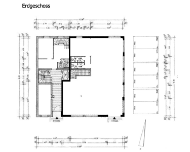 Aktuell hat die Fläche im EG keine Zwischenwände und kann deshalb flexibel (auch mit Trennwänden) aufgeteilt werden. Es gibt zwei getrennte WCs. Eine Klimaanlage ist vorhanden. Die Räume haben eine ideale Raumakustik und kann sowohl als Großraumbüro genutzt werden oder in Einzelbüros/Praxisräume aufgeteilt werden.