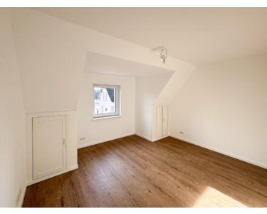 Die Wohnung erstreckt sich über das 1. Obergeschoss und das ausgebaute Dachgeschoss. Zwei Zimmer befinden sich im 1. OG und verfügen über maßgefertigte Einbauschränke unter den Dachschrägen, die zusätzliche Nutzfläche schaffen. Ein weiteres, großzügiges Zimmer liegt im Dachgeschoss und eignet sich ideal als Wohnzimmer, Büro oder Rückzugsort.
