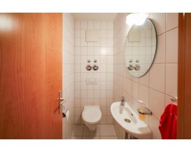 Ein modernes Badezimmer mit Badewanne und Waschmaschinenanschluss sowie ein separates Gäste-WC runden das ganze ab.