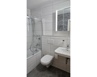 * innenliegendes Bad, raumhoch in der Farbe Weiß gefliest, eine Wand mit grauen Fliesen im Mosaik-Stil; mit Badewanne mit Duschtrennwand, Waschbecken, Spiegelschrank, Toilette und Handtuchheizkörper