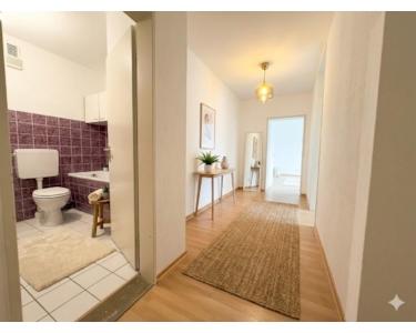 Die Küche schließt unmittelbar an den Wohn- und Essbereich an und ist sehr praktisch gelegen. Sie ist ebenfalls hell und bietet durch ihre Nähe zum Wohnraum eine angenehme Verbindung zwischen Kochen und gemeinsamen Momenten. Ein kleiner Flur verbindet den Wohnbereich mit den privaten Räumen der Wohnung. Hier befinden sich das Kinderzimmer, das Elternschlafzimmer sowie das Badezimmer. Das Bad bietet einen besonderen Komfort, da es sowohl eine Badewanne als auch eine separate Dusche besitzt – ideal für flexible Alltagssituationen, egal ob schnelle Dusche oder entspannter Wellness-Moment. Zusätzlich gibt es einen sehr wertvollen Abstellraum, der Platz für Haushaltsgeräte, Vorräte oder Reinigungsutensilien bietet und damit für Ordnung und Struktur sorgt. Insgesamt präsentiert sich die Wohnung hell, modern und gut geschnitten, mit einem besonderen Fokus auf Komfort, Alltagstauglichkeit und wohnlicher Atmosphäre.