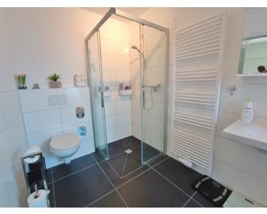- Tageslichtbad mit ebenerdiger Dusche (90x100) samt Glasabtrennung und Handtuchheizkörper