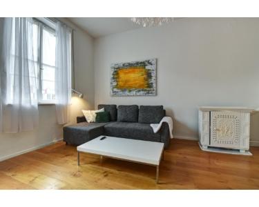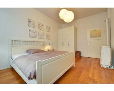 Die Altbautypischen hohen Decken sorgen für extra Wohlfühlflair, ebenso wie die schöne Möblierung, Kissen, Bettwäsche und Deko im Skandi-Style - ein echter Wohlfühlort.
