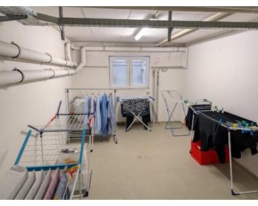 Eigener Stellplatz für Waschmaschine und Trockner im Wasch- und Trockenraum.