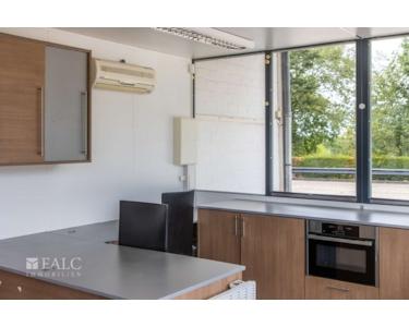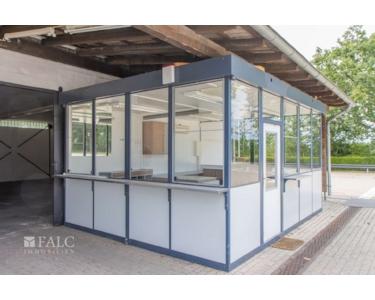 Neben der großen Lagerhalle befindet sich ein weiterer Raum mit einer kleinen Küchenzeile und integriertem Backofen, welcher perfekt als Büro oder Mitarbeiterraum genutzt werden kann. Angrenzend an den Büroraum und das Schiebetor gibt es einen überdachten Außenbereich.