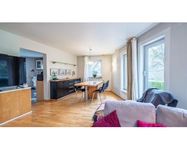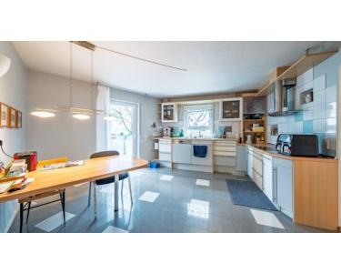 Herzstück des Hauses ist das weitläufige Wohn- und Esszimmer - ein lichtdurchfluteter Raum mit großen Fensterflächen und einem harmonischen Blick in den umlaufenden, gepflegten Garten. Ein behaglicher Kamin schafft dabei ein besonders gemütliches Ambiente und lädt zum Verweilen ein. Vom Wohnzimmer aus gelangen Sie direkt auf die Terrasse und in den Garten. Auch von der angrenzenden, großzügig gestalteten Küche besteht ein direkter Zugang auf eine zweite Terrasse, die sich ideal für entspannte Stunden im Freien anbietet. Der im Wohn- und Essbereich verlegte hochwertige Parkettboden sorgt für eine warme und einladende Wohnatmosphäre.