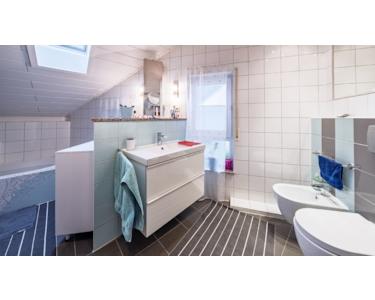 Im Obergeschoss befinden sich neben dem großzügigen Badezimmer, ein komfortables Schlafzimmer sowie zwei weitere Zimmer, die flexibel als Kinderzimmer, Gästezimmer oder Homeoffice genutzt werden können. Das Schlafzimmer verfügt zusätzlich über einen offenen Zugang zum angrenzenden Ankleidezimmer, was für besondere Großzügigkeit und Komfort sorgt.