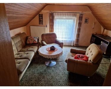 Das Obergeschoss wurde bereits ausgebaut, stellt jedoch in seiner jetzigen Form keine vollständig nutzbare Wohnfläche dar. Eine Doppelgarage bietet Platz für Fahrzeuge und zusätzliche Staumöglichkeiten. Die Ölheizung aus dem Jahr 1995 versorgt das Gebäude mit Wärme, und ein 3.000-Liter-Kunststofftank sorgt für ausreichend Heizölreserven.