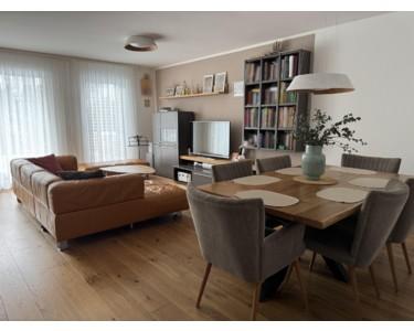 Großzügige, bodentiefe Fenster schaffen ein lichtdurchflutetes Wohnambiente. Der offen gestaltete Wohn- und Essbereich mit hochwertiger Einbauküche bildet das Herzstück der Wohnung und bietet direkten Zugang zur sonnigen Terrasse mit Garten in Südausrichtung – ideal zum Entspannen und Genießen. Der durchgehend verlegte Eichendielenboden unterstreicht die warme, zeitlose Wohnatmosphäre.