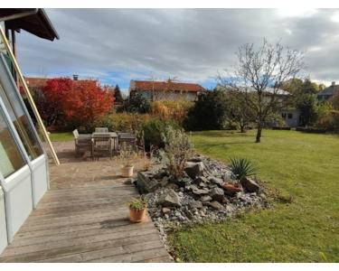 Ebenso erreicht man von dort aus die Terrassen auf der Ost-, Süd- und Westseite, und den weitläufigen, eingewachsenen Garten, der von einem Gartenarchitekten geplant und mit den unterschiedlichsten Sträuchern und Bäumen bepflanzt wurde. Hier findet man mehrere geschützte Rückzugsorte zum Verweilen. Vor drei Jahren wurde ein neues Gerätehaus errichtet, das alle nützlichen Gartengeräte beherbergt.