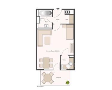 Die Wohnfläche ist gut aufgeteilt in einen geräumigen Wohnbereich, eine separate Küche, ein hell gefliestes Badezimmer mit Badewanne und eine bemerkenswerte Terrasse mit großzügiger Grünfläche. Den Wohnungseingang im Erdgeschoss erreicht man über das gepflegte Treppenhaus. Die großzügige Diele im Eingangsbereich beherbergt einen Abstellraum und bietet Platz für eine Garderobe.