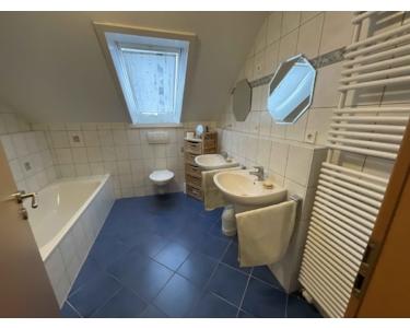 Über eine freitragende Treppe gelangen Sie ins das Dachgeschoss. Hier erwarten Sie drei geräumige Zimmer, die individuell als Schlafzimmer, Büro oder Kinderzimmer gestaltet werden können. Aktuell sind die Böden noch mit Teppich ausgelegt. Sowohl das großzügige elterliche Schlafzimmer, das ausreichend Platz für ein Doppelbett und einen Kleiderschrank bietet, als auch das angrenzende Kinderzimmer punkten mit einem direkten Zugang zum Balkon. Abschließend steht Ihnen noch ein raumhoch gefliestes Familienbad, das mit zwei Waschbecken, einer Toilette, einer Badewanne und einer separaten Duschkabine ausgestattet ist, zur Verfügung. Ein praktisches Dachfenster sorgt hier für die entsprechende Belüftung. Eine Einschubtreppe führt Sie weiter in den Dachspeicher, der Ihnen zusätzlichen Stauraum bietet.