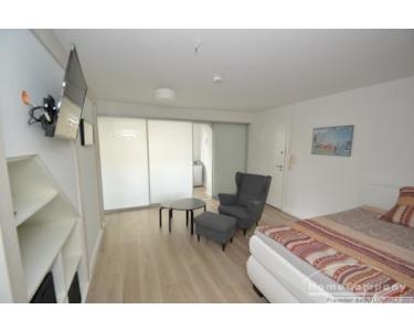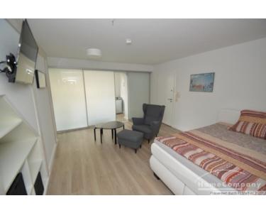Bei dieser Wohnung handelt es sich um einen Erstbezug nach Sanierung und neu Möblierung. Der besondere Clou bei dieser Wohnung ist eine Milchglastrennwand zwischen der voll ausgestatteten Küche und dem Wohnbereich. Je nach Lust und Laune, kann man den Wohnraum zur Küche schließen. Hinter der "Fernsehwand" befindet sich noch ein kleiner Abstellraum. Das Badezimmer entspricht dem modernen Standard.