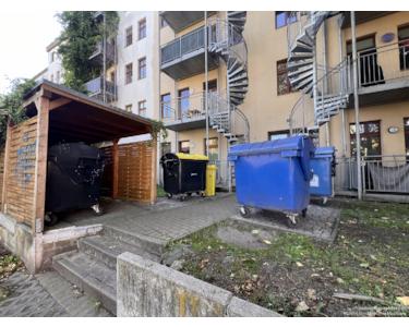 Die gepflegte Außenanlage umfasst einen gepflasterten Innenhof mit Zugang zum Seitenhaus sowie einen Müllplatz. Der Innenhof trägt zu einem aufgeräumten Gesamtbild bei und ermöglicht einen bequemen Zugang zu weiteren Bereichen des Hauses.
