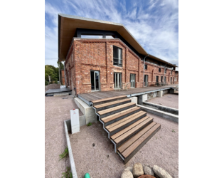 - Breite Stahltreppe (2,2 m) mit Holzbelag führt direkt in den Garten