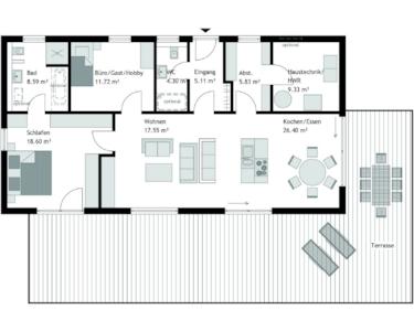 Entdecken Sie die Möglichkeiten, Ihr Traumhaus als Bungalow mit einem Satteldach zu realisieren und erleben Sie eine zeitgemäße Architektur gepaart mit einem einzigartigen Raumkonzept. Der Wohn-/Ess- und Kochbereich erstreckt sich über großzügige 44 m² und bietet höchsten Komfort. Eine halbhohe Wand, die optional auch raumhoch sein kann, trennt geschickt den Koch- vom Wohnbereich und schafft so eine harmonische Balance zwischen gemeinsamen Beisammensein und klarer Struktur. Große Panoramafenster sowie eine geräumige Panorama-Hebeschiebetür sorgen für ein helles und offenes Ambiente, das Innen- und Außenbereich harmonisch miteinander verbindet. Der Schlafbereich überzeugt mit großzügiger Stellfläche für Schränke und einem direkten Zugang zum geräumigen Badezimmer. Ein zusätzlicher Raum, flexibel als Büro, Gäste- oder Hobbyraum nutzbar, sowie ein zweites Badezimmer mit optionaler Dusche, runden das Raumangebot ab. Auf Anfrage kann der Grundriss des Bungalows auch barrierefrei gestaltet werden, um allen individuellen Bedürfnissen gerecht zu werden.