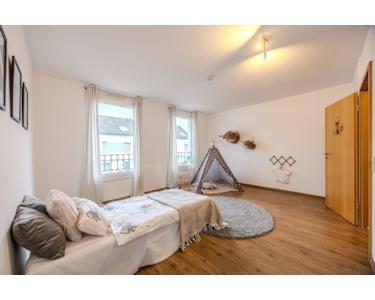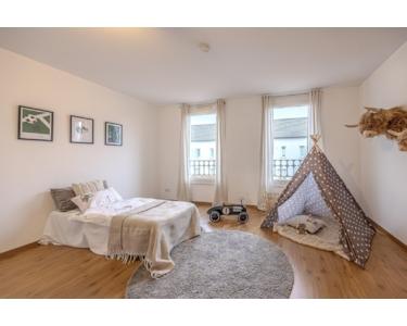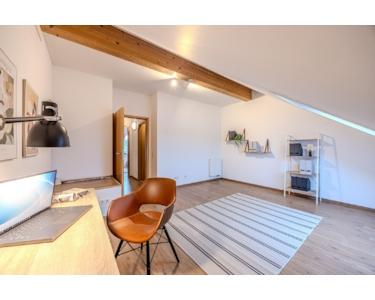 Im Obergeschoss erwarten Sie zwei helle, gut geschnittene Zimmer, die sich ideal als Elternschlafzimmer, Kinderzimmer oder Homeoffice nutzen lassen. Das Hauptschlafzimmer verfügt über eine praktische, begehbare Nische, die sich hervorragend als Kleiderschrank einrichten lässt – ein cleverer Stauraum, der Ordnung und Komfort vereint.
